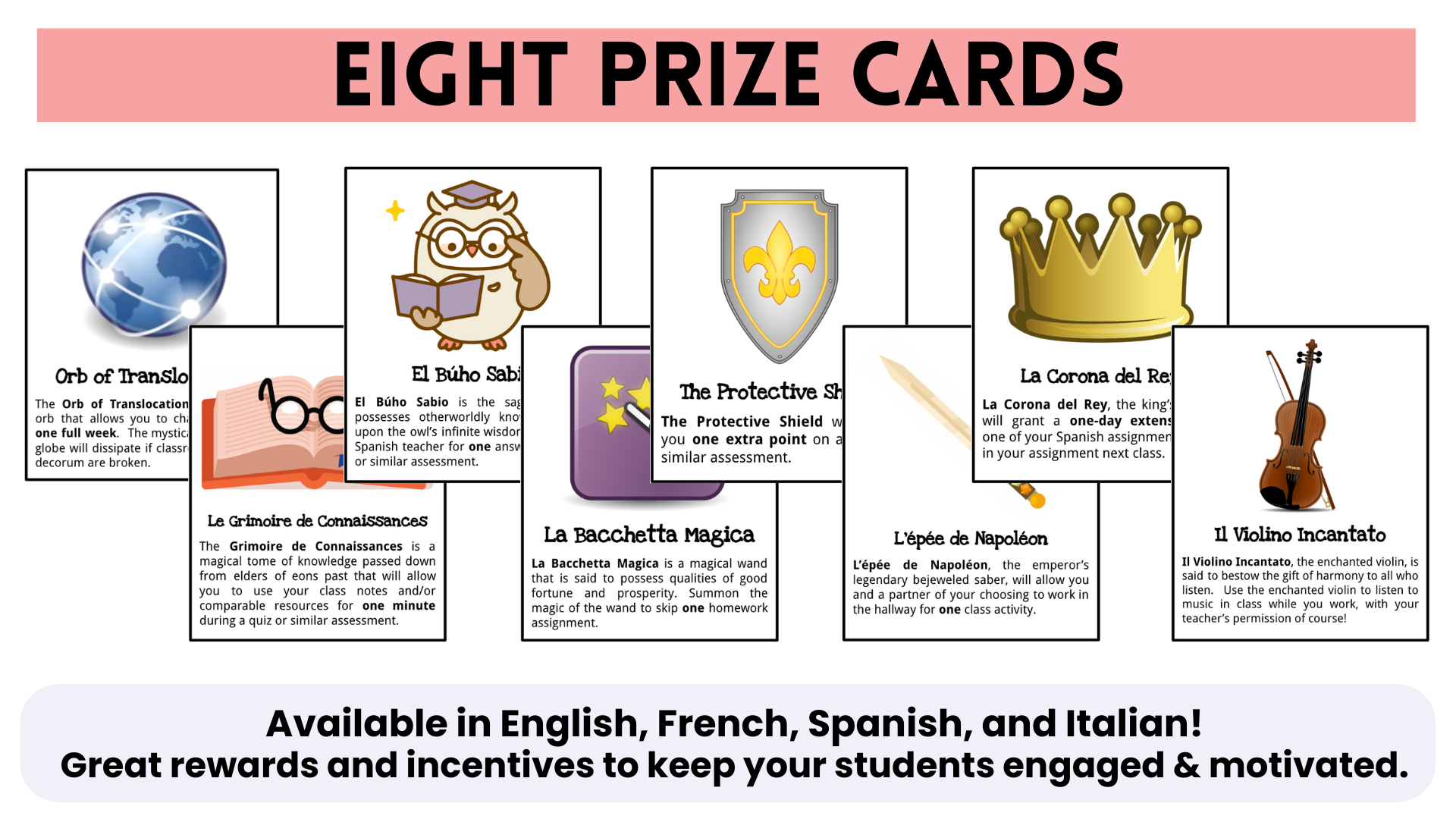 I’m going to incentivize students to use target language by rewarding them with TL Points (Target Language Points). Every time I encounter a student using the target language in class in a creative way, they will get a raffle ticket on which they will write their name and place in a raffle box located at the front of my classroom. I’ll hold a raffle every two weeks, and the winners from each class will receive a World Language Class Reward/Incentive, pictured below: